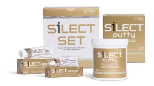 SILECT is a premium condensation curing impression material with excellent technical values. Notable features include very low shrinkage and very high recovery. The materials have high contrast and the consistencies are ideally matched. The gel-like catalyst can be dosed precisely and is easy to process.